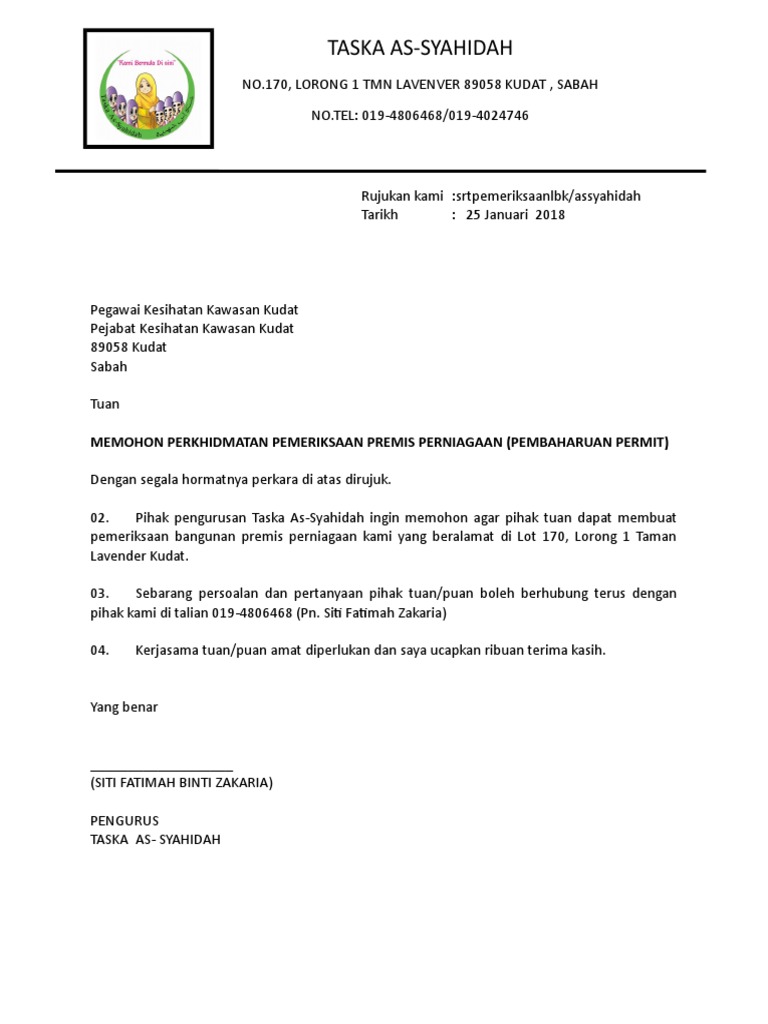 Surat Memohon Pemeriksaan Premis Perniagaan Taska Kesihatan Pdf